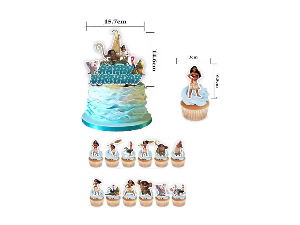 Balenie č. 1 (4492A) obsahuje 13 kusov: 1x Ozdoba na tortu Happy Birthday (15,7x14,6cm) s motívom Vaiany a jej priateľov 12 x zapichovátka (výška postavičiek 5-7cm bez špáradla)