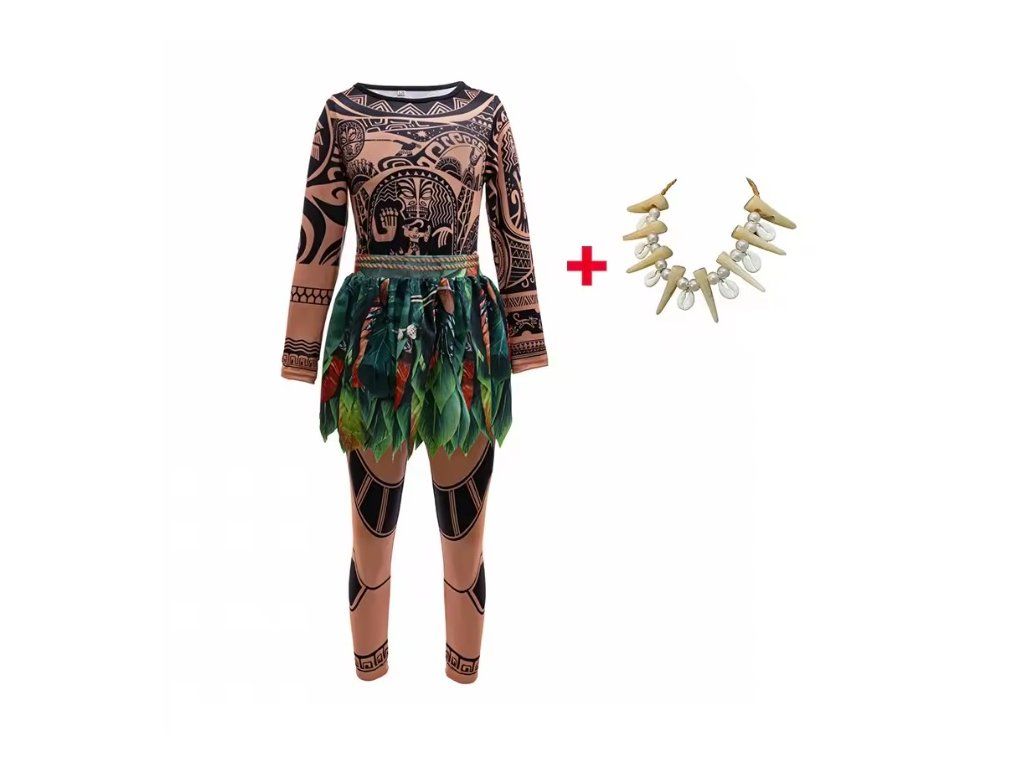 Spodnú časť tvoria nohavice s potlačou tetovaní a našitá sukňa, ktorá dotvára autentický ostrovný štýl. Celý kostým je pohodlný, ľahký a navrhnutý tak, aby neobmedzoval dieťa v pohybe – či už pri tanci, hre alebo dobrodružstvách.